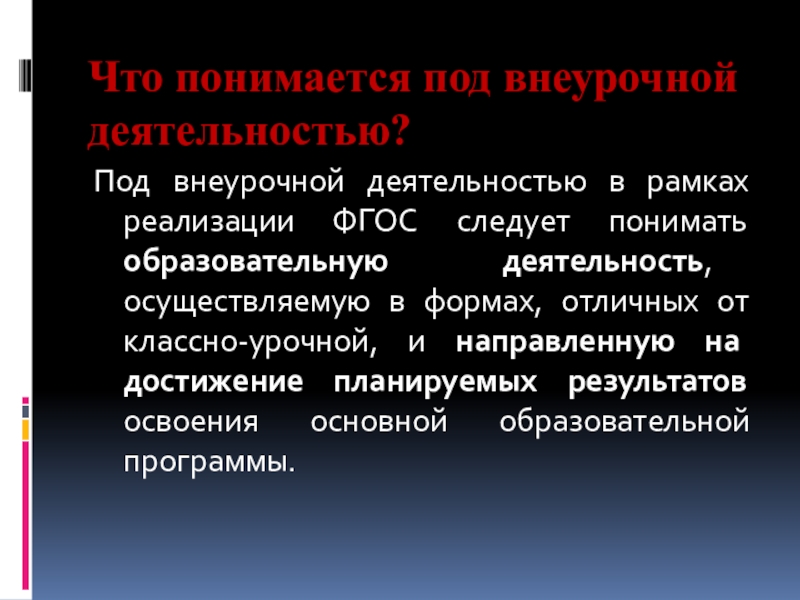 следует понимать образовательную деятельность, осуществляемую в формах, отличных от классно-урочной, и направленную на достижение планируемых результатов освоения основной образовательной программы.