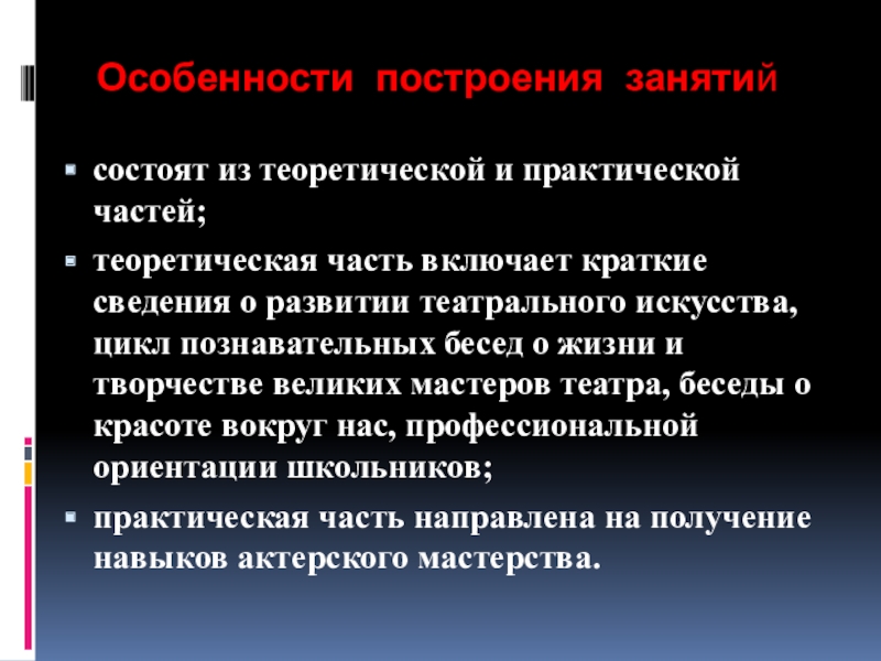 сведения о развитии театрального искусства, цикл познавательных бесед о жизни и творчестве великих мастеров театра, беседы о красоте вокруг нас, профессиональной ориентации школьников;