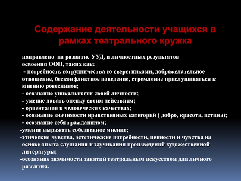 Слайд 11Содержание деятельности учащихся в рамках театрального кружка
