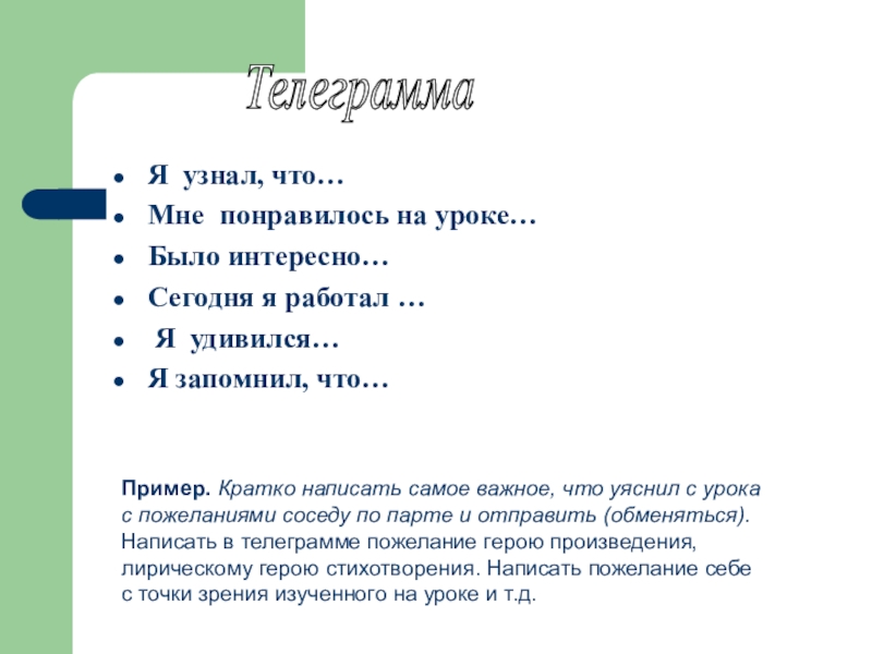 Пример. Кратко написать самое важное, что уяснил с урока с пожеланиями соседу по парте и отправить (обменяться). Написать в телеграмме пожелание герою произведения, лирическому герою стихотворения. Написать пожелание себе с точки зрения изученного на уроке и т.д.