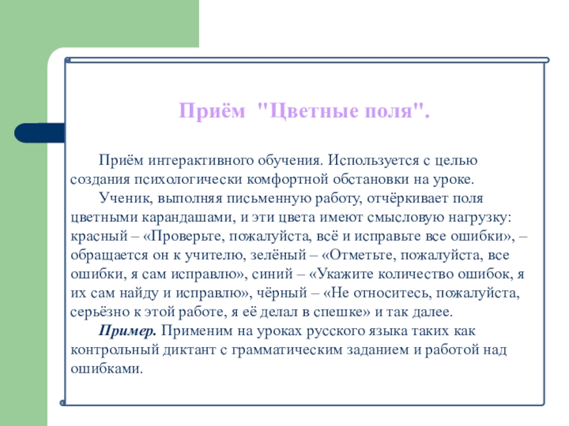 Пример. Применим на уроках русского языка таких как контрольный диктант с грамматическим заданием и работой над ошибками.