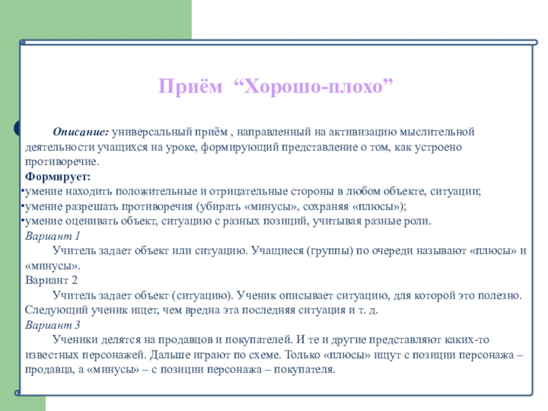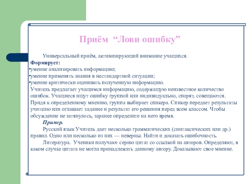 Описание: универсальный приём, направленный на активизацию мыслительной деятельности и привлечение
