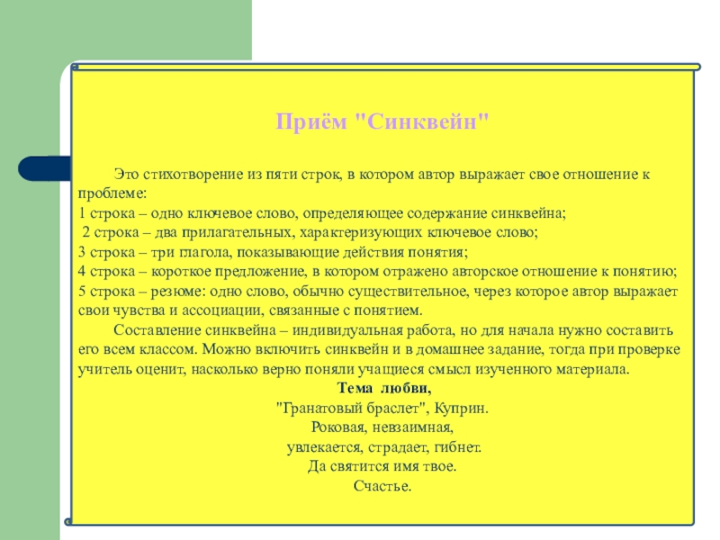 Составление синквейна – индивидуальная работа, но для начала нужно составить его всем классом. Можно включить синквейн и в домашнее задание, тогда при проверке учитель оценит, насколько верно поняли учащиеся смысл изученного материала.