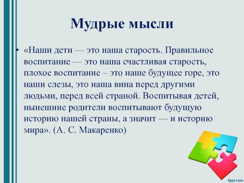 наша счастливая старость, плохое воспитание – это наше будущее горе, это наши слезы, это наша вина перед другими людьми, перед всей страной. Воспитывая детей, нынешние родители воспитывают будущую историю нашей страны, а значит — и историю мира». (А. С. Макаренко)