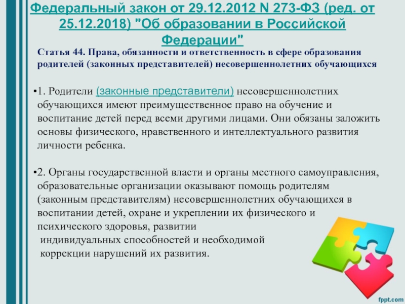 Слайд 2Федеральный закон от 29.12.2012 N 273-ФЗ (ред. от 25.12.2018) "Об образовании