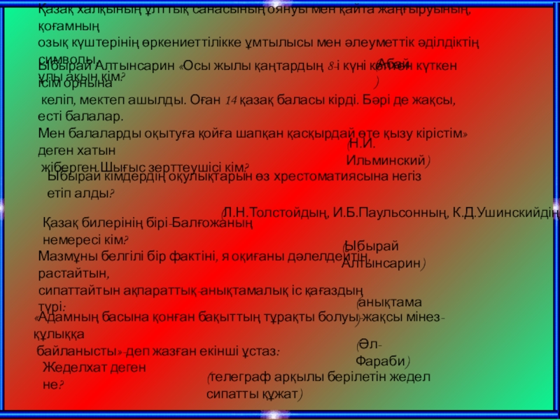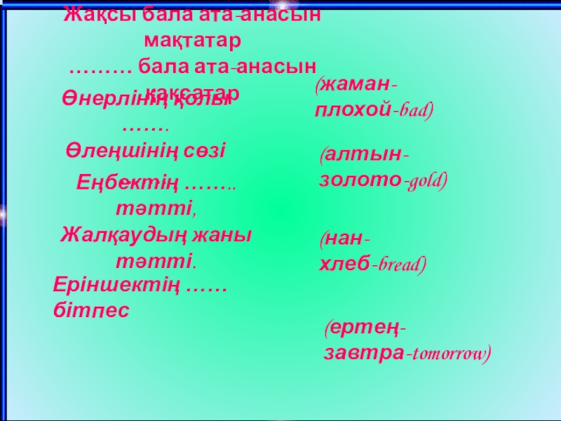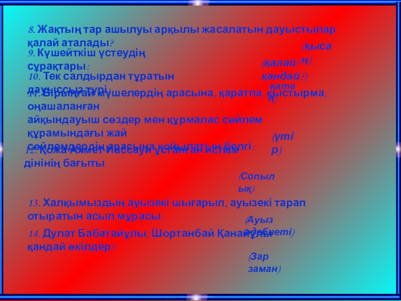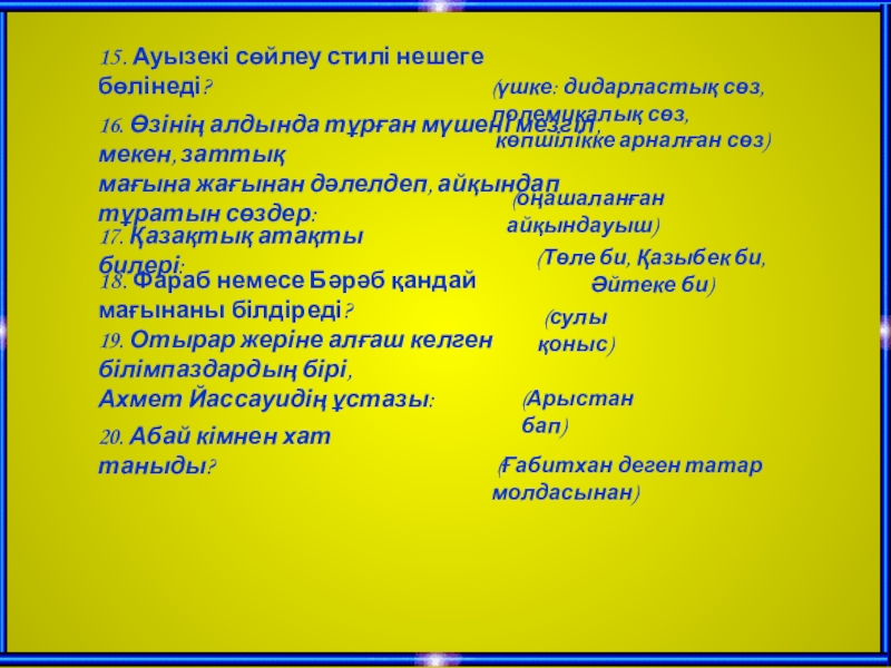 13. Халқымыздың ауызекі шығарып, ауызекі тарап отыратын асыл мұрасы: