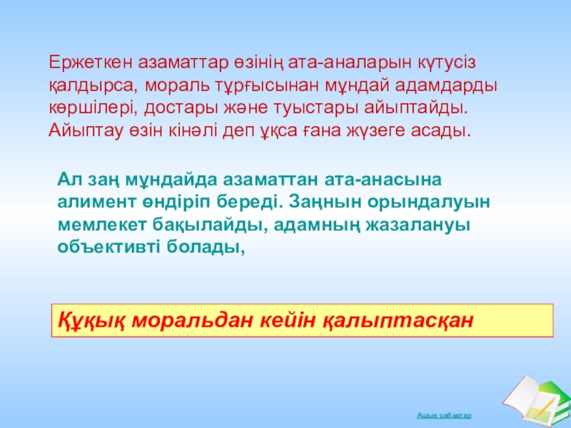 Ал заң мұндайда азаматтан ата-анасына алимент өндіріп береді. Заңнын орындалуын мемлекет бақылайды, адамның жазалануы объективті болады,