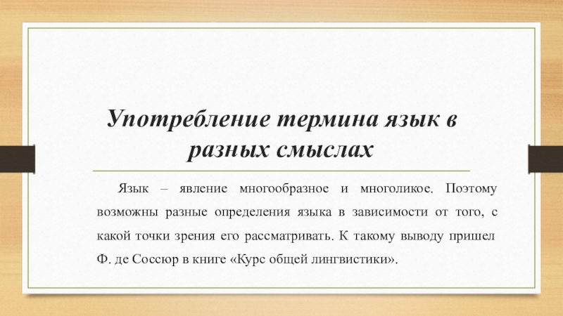 Поэтому возможны разные определения языка в зависимости от того, с какой точки зрения его рассматривать. К такому выводу пришел Ф. де Соссюр в книге «Курс общей лингвистики».