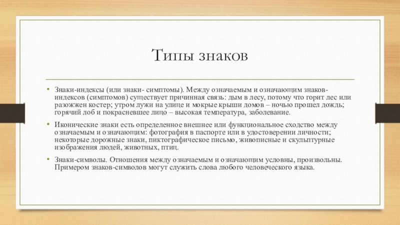 Знаки-символы. Отношения между означаемым и означающим условны, произвольны. Примером знаков-символов могут служить слова любого человеческого языка.