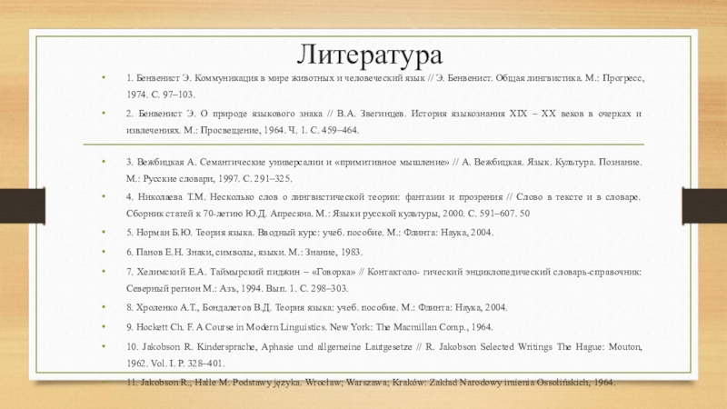 1. Бенвенист Э. Коммуникация в мире животных и человеческий язык //