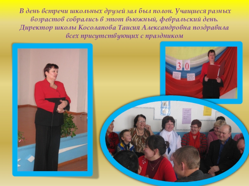 В день встречи школьных друзей зал был полон. Учащиеся разных возрастов собрались в этот вьюжный, февральский день. Директор школы Косолапова Таисия Александровна поздравила всех присутствующих с праздником