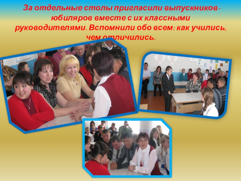 Слайд 4 За отдельные столы пригласили выпускников-юбиляров вместе с их классными руководителями.