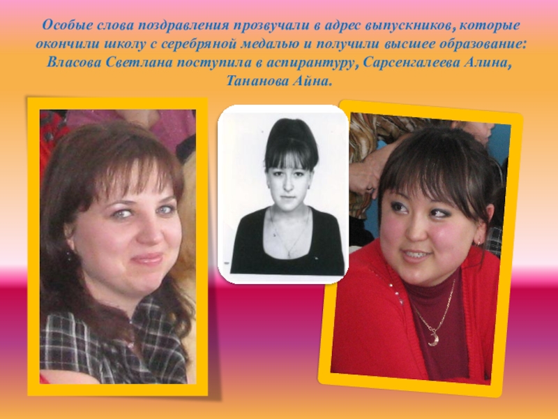 с серебряной медалью и получили высшее образование: Власова Светлана поступила в аспирантуру, Сарсенгалеева Алина, Тананова Айна.