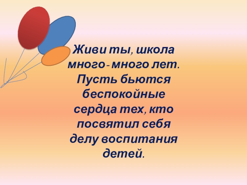 Живи ты, школа много- много лет. Пусть бьются беспокойные сердца тех, кто посвятил себя делу воспитания детей.