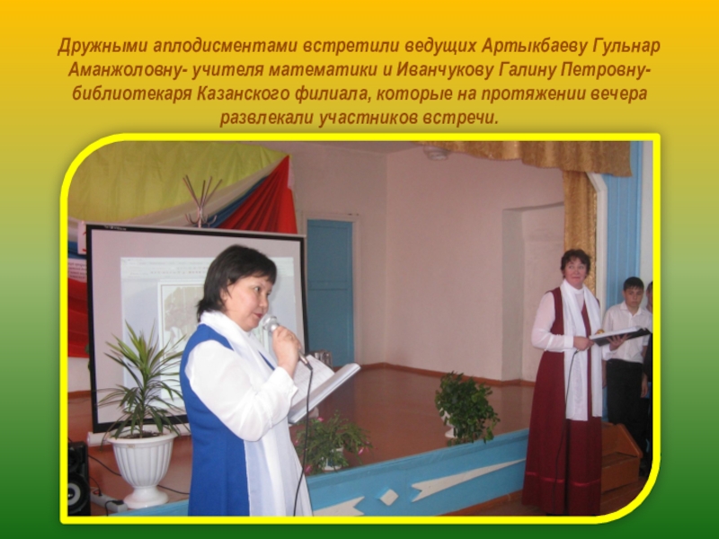Дружными аплодисментами встретили ведущих Артыкбаеву Гульнар Аманжоловну- учителя математики и Иванчукову Галину Петровну- библиотекаря Казанского филиала,