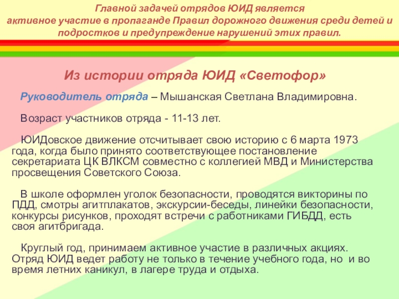 Круглый год, принимаем активное участие в различных акциях. Отряд ЮИД ведет работу не только в течение учебного года, но и во время летних каникул, в лагере труда и отдыха.