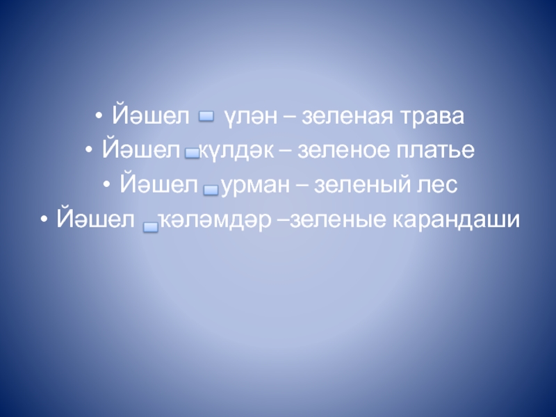 Йәшел   үлән – зеленая траваЙәшел  күлдәк – зеленое платьеЙәшел  урман – зеленый лесЙәшел