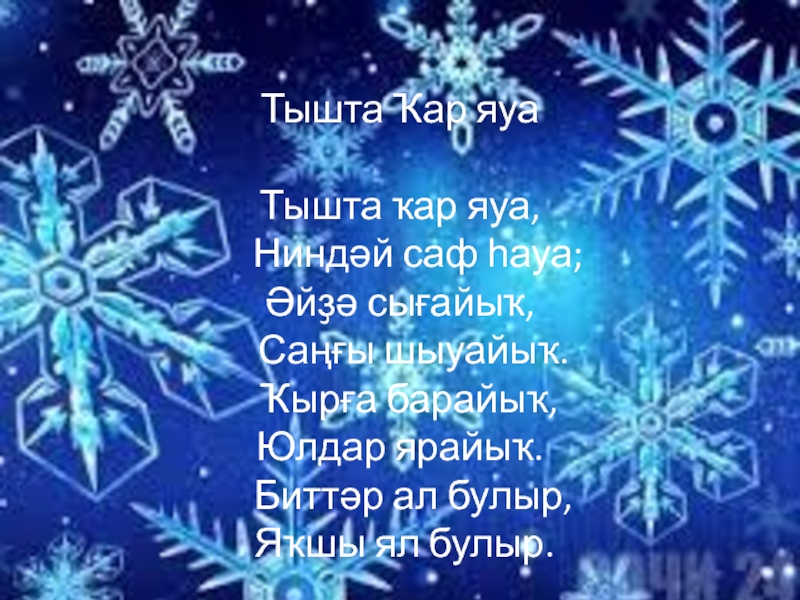 Тышта Ҡар яуаТышта ҡар яуа,  Ниндәй саф һауа;Әйҙә сығайыҡ,  Саңғы шыуайыҡ. Ҡырға барайыҡ,Юлдар ярайыҡ.