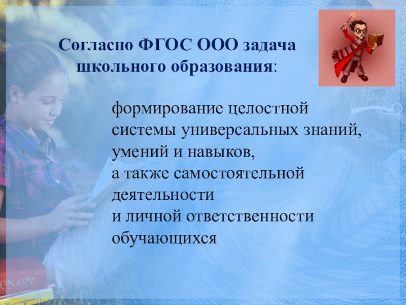 Слайд 3Согласно ФГОС ООО задача школьного образования: