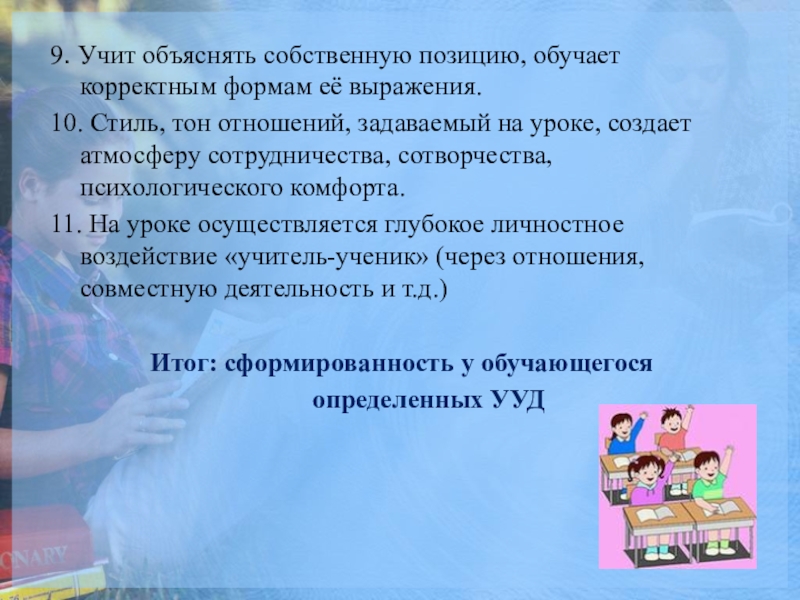 Слайд 109. Учит объяснять собственную позицию, обучает корректным формам её выражения.