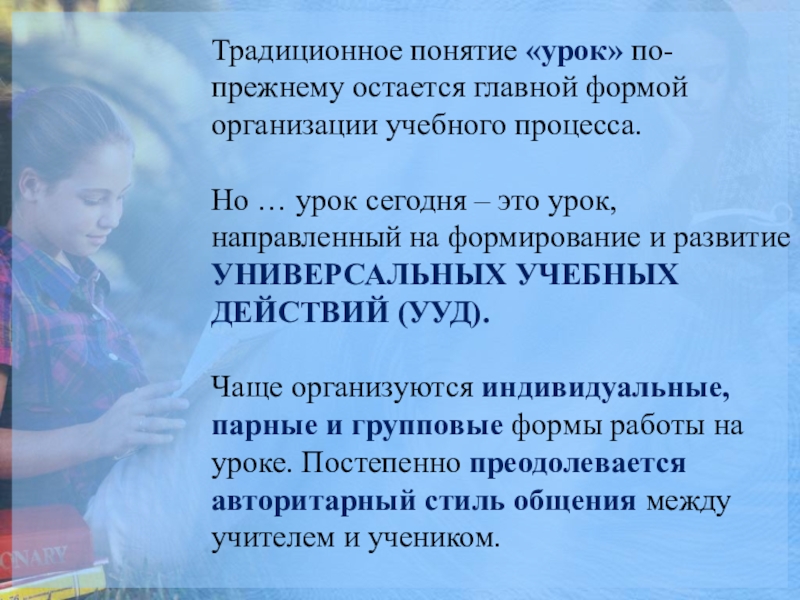 Чаще организуются индивидуальные, парные и групповые формы работы на уроке. Постепенно преодолевается авторитарный стиль общения между учителем и учеником.