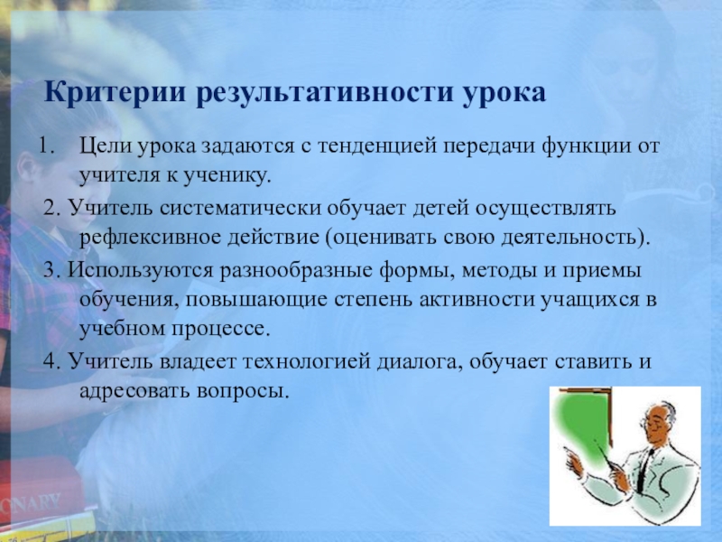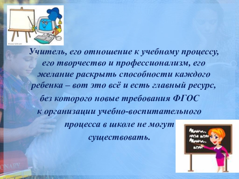 Слайд 18 Учитель, его отношение к учебному процессу, его творчество и