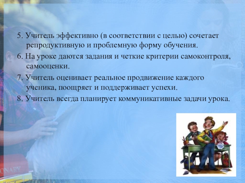 7. Учитель оценивает реальное продвижение каждого ученика, поощряет и поддерживает успехи.