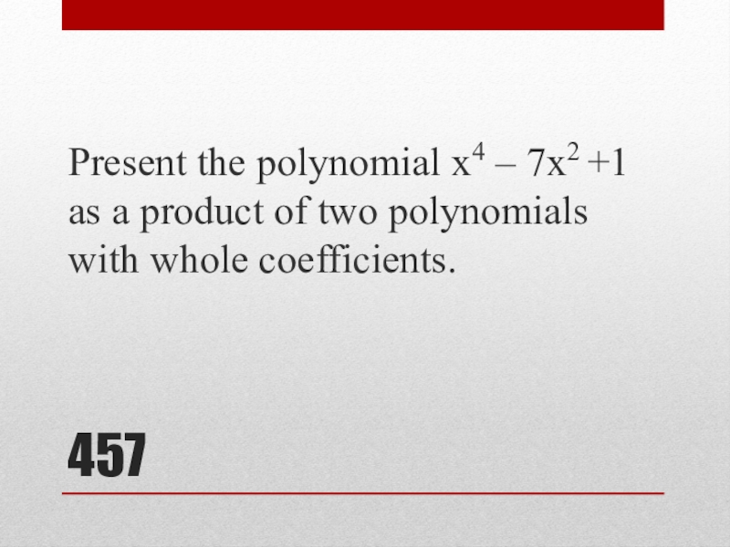 457Present the polynomial x4 – 7x2 +1 as a product of two polynomials with whole coefficients.