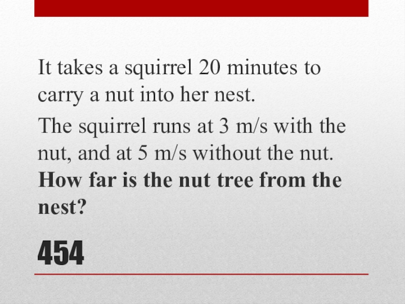 454It takes a squirrel 20 minutes to carry a nut into her nest. The squirrel runs at