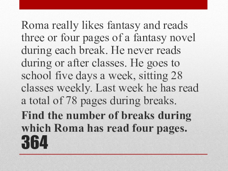 364Roma really likes fantasy and reads three or four pages of a fantasy novel during each break.
