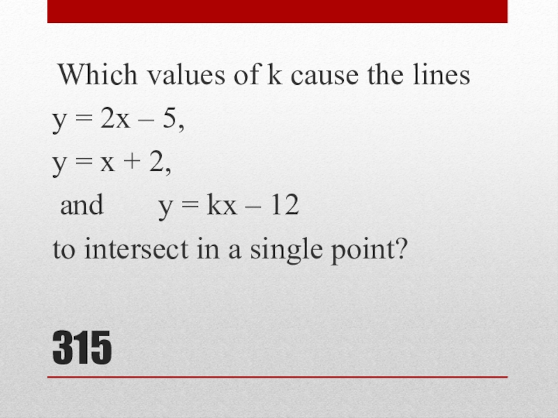 315 Which values of k cause the lines y = 2x – 5, y = x + 2, and y = kx – 12 to intersect in a single point?