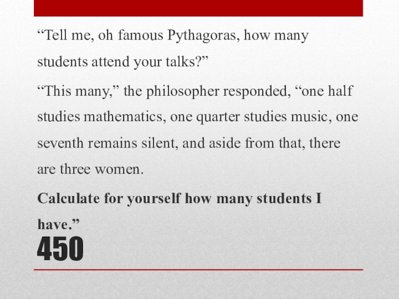 450“Tell me, oh famous Pythagoras, how many students attend your talks?”“This many,” the philosopher responded, “one half