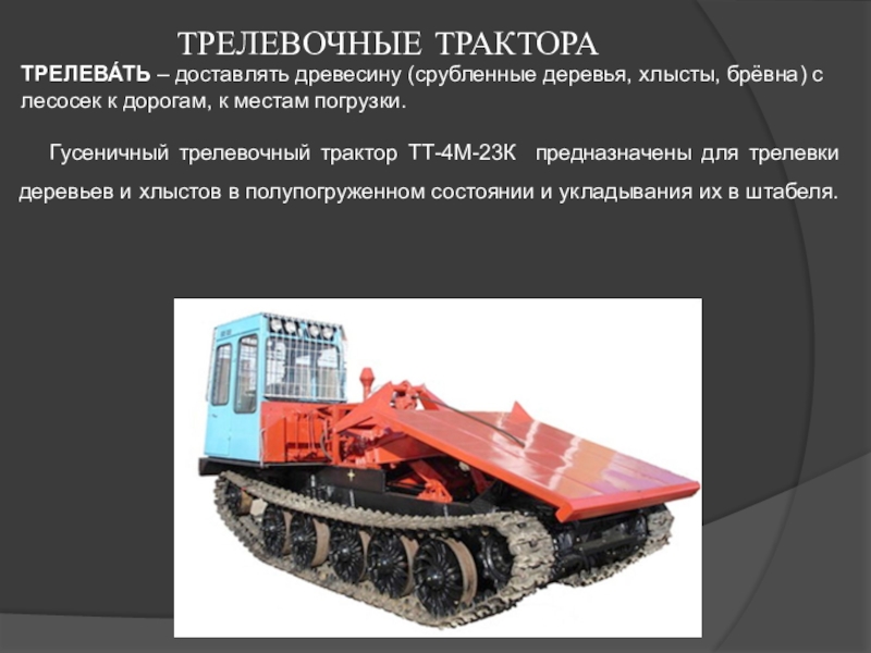 Гусеничный трелевочный трактор ТТ-4М-23К предназначены для трелевки деревьев и хлыстов в полупогруженном состоянии и укладывания их в штабеля.