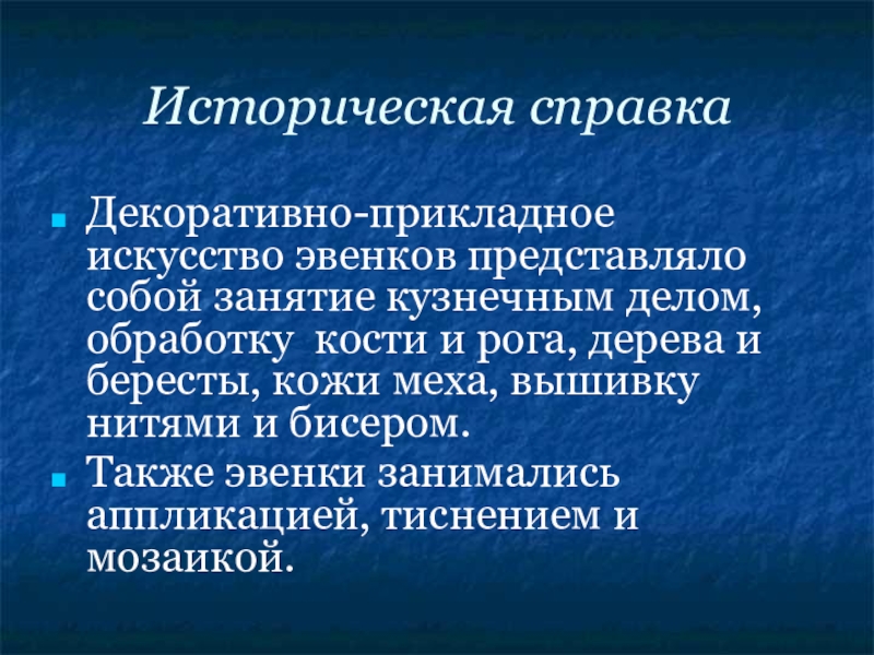 Историческая справкаДекоративно-прикладное искусство эвенков представляло собой занятие кузнечным делом, обработку кости и рога, дерева и бересты, кожи