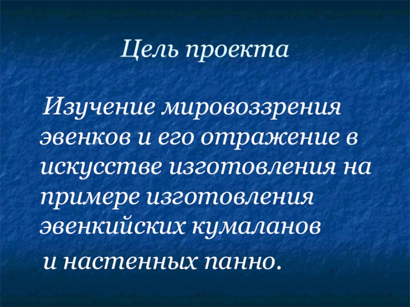 Цель проекта Изучение мировоззрения эвенков и его отражение в искусстве изготовления на примере изготовления эвенкийских кумаланов и настенных панно.