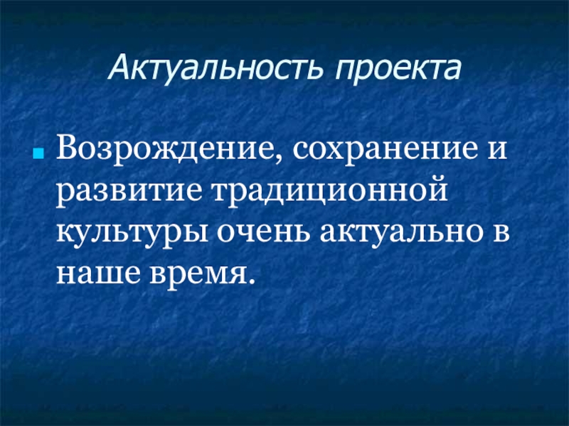 Актуальность проектаВозрождение, сохранение и развитие традиционной культуры очень актуально в наше время.