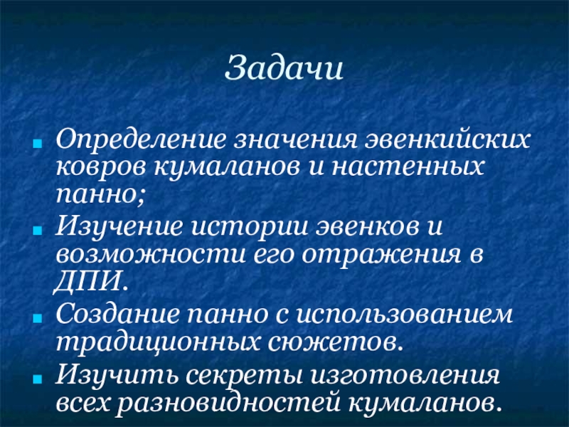 Задачи Определение значения эвенкийских ковров кумаланов и настенных панно;Изучение истории эвенков и возможности его отражения в ДПИ.