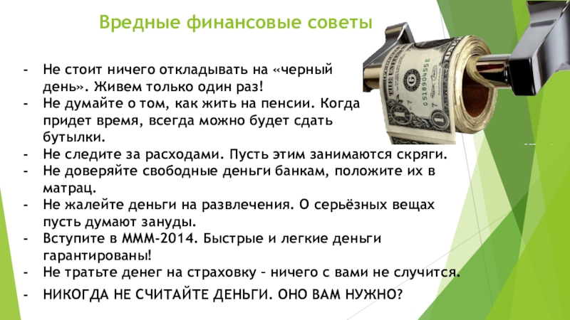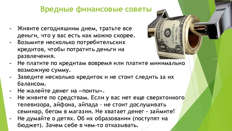 Не живите по средствам. Если у вас нет еще сверхтонкого телевизора, айфона, айпада – не стоит дослушивать семинар, бегом в магазин. Не хватает денег – займите!