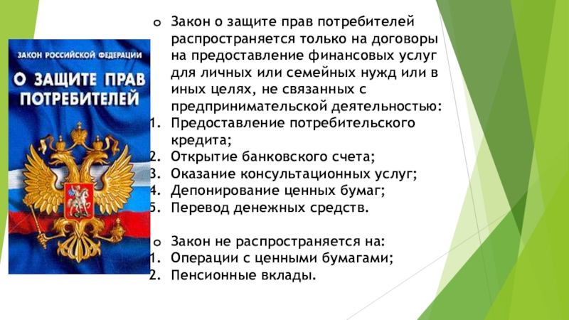 Слайд 6Закон о защите прав потребителей распространяется только на договоры на предоставление