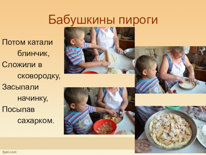 Бабушкины пирогиПотом катали    блинчик,Сложили в    сковородку, Засыпали    начинку,Посыпав
