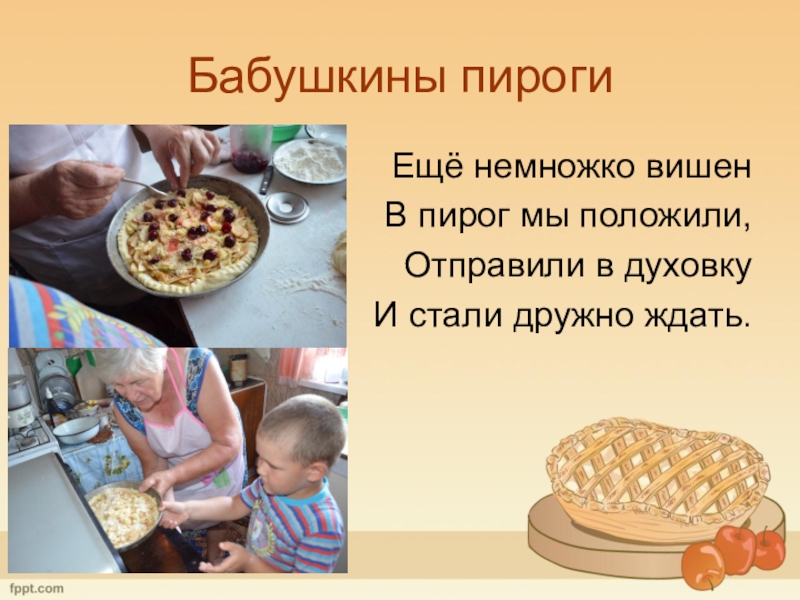 Бабушкины пирогиЕщё немножко вишенВ пирог мы положили,Отправили в духовкуИ стали дружно ждать.