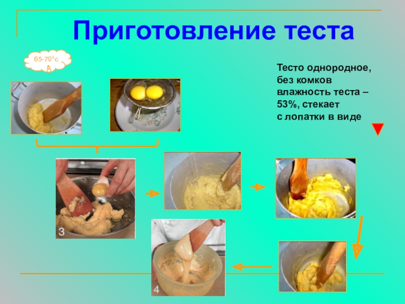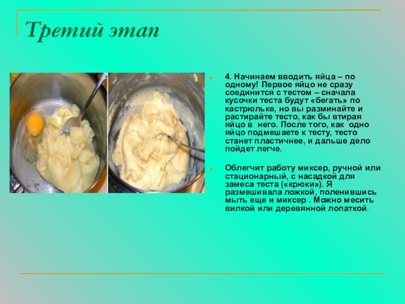 гладкости. Смотрим – правильное тесто должно быть слегка блестящим, глянцевым, и вязким. Зачерпните ложкой – оно должно очень медленно с этой ложки сползать, тянуться длинными «языками». Обычно четырех яиц для этого достаточно! Но если тесто получилось слишком густым, его можно исправить - возьмите еще одно яйцо, разболтайте его в стакане, и подмешивайте понемногу, по ложке, проверяя консистенцию (может понадобиться не все яйцо).