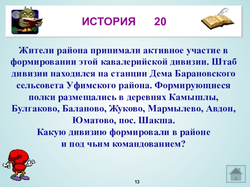 этой кавалерийской дивизии. Штаб дивизии находился на станции Дема Барановского сельсовета Уфимского района. Формирующиеся полки размещались в деревнях Камышлы, Булгаково, Баланово, Жуково, Мармылево, Авдон, Юматово, пос. Шакша.