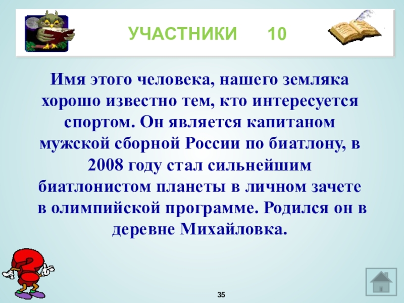 нашего земляка хорошо известно тем, кто интересуется спортом. Он является капитаном мужской сборной России по биатлону, в 2008 году стал сильнейшим биатлонистом планеты в личном зачете в олимпийской программе. Родился он в деревне Михайловка.