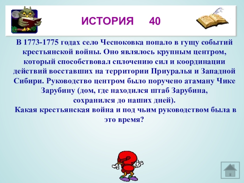 событий крестьянской войны. Оно являлось крупным центром, который способствовал сплочению сил и координации действий восставших на территории Приуралья и Западной Сибири. Руководство центром было поручено атаману Чике Зарубину (дом, где находился штаб Зарубина,