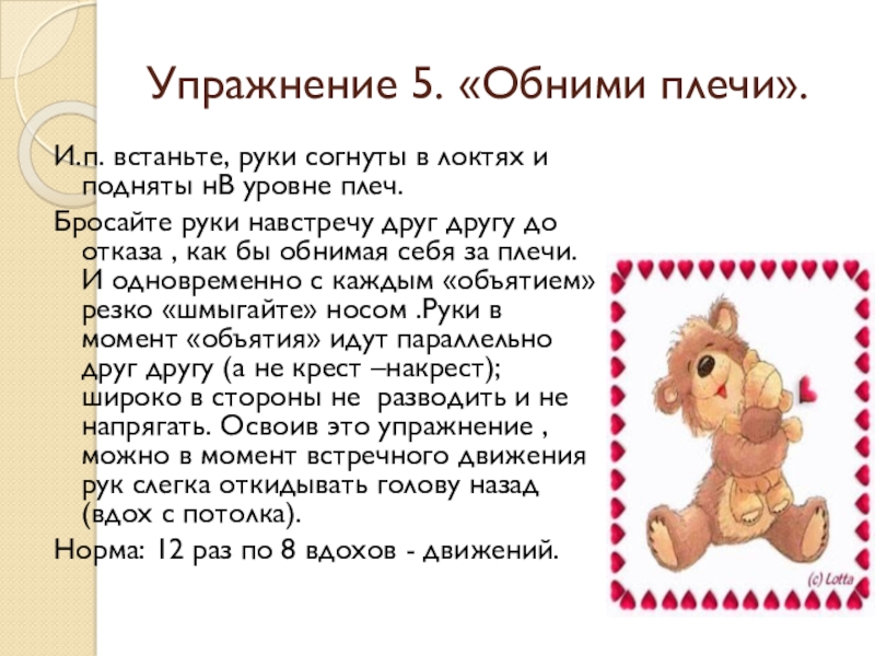 Бросайте руки навстречу друг другу до отказа , как бы обнимая себя за плечи. И одновременно с каждым «объятием» резко «шмыгайте» носом .Руки в момент «объятия» идут параллельно друг другу (а не крест –накрест); широко в стороны не разводить и не напрягать. Освоив это упражнение , можно в момент встречного движения рук слегка откидывать голову назад (вдох с потолка).