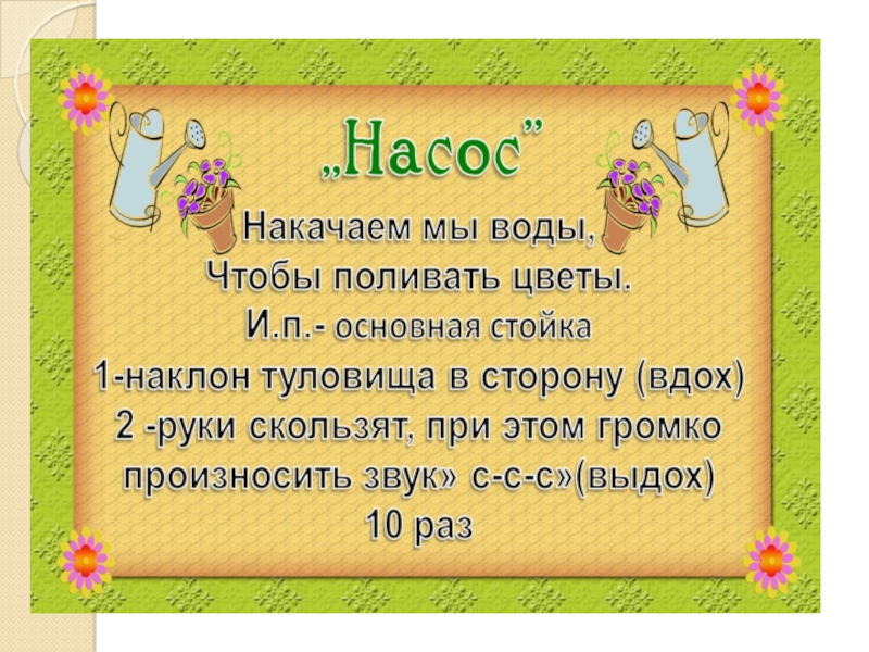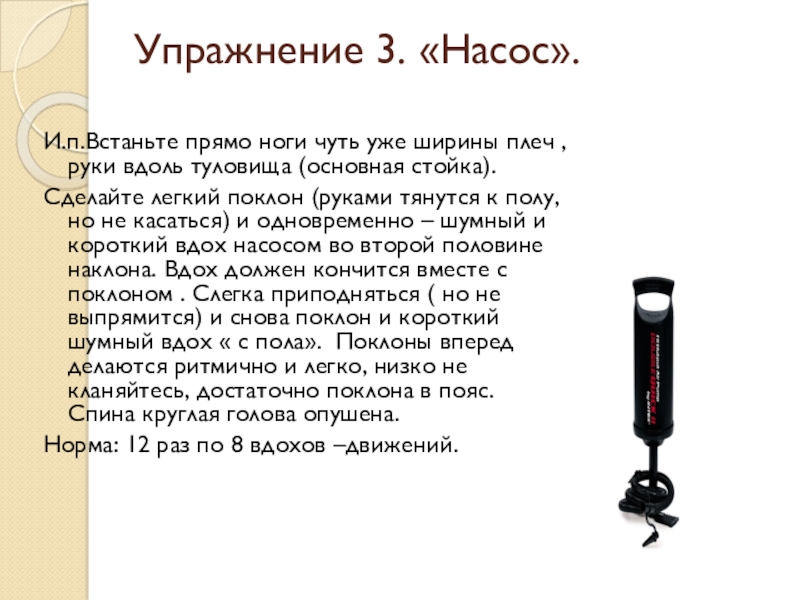 Сделайте легкий поклон (руками тянутся к полу, но не касаться) и одновременно – шумный и короткий вдох насосом во второй половине наклона. Вдох должен кончится вместе с поклоном . Слегка приподняться ( но не выпрямится) и снова поклон и короткий шумный вдох « с пола». Поклоны вперед делаются ритмично и легко, низко не кланяйтесь, достаточно поклона в пояс. Спина круглая голова опушена.