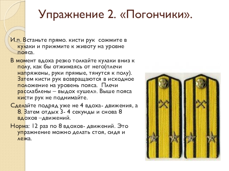 В момент вдоха резко толкайте кулаки вниз к полу, как бы отжимаясь от него(плечи напряжены, руки прямые, тянутся к полу). Затем кисти рук возвращаются в исходное положение на уровень пояса. Плечи расслаблены – выдох «ушел». Выше пояса кисти рук не поднимайте.