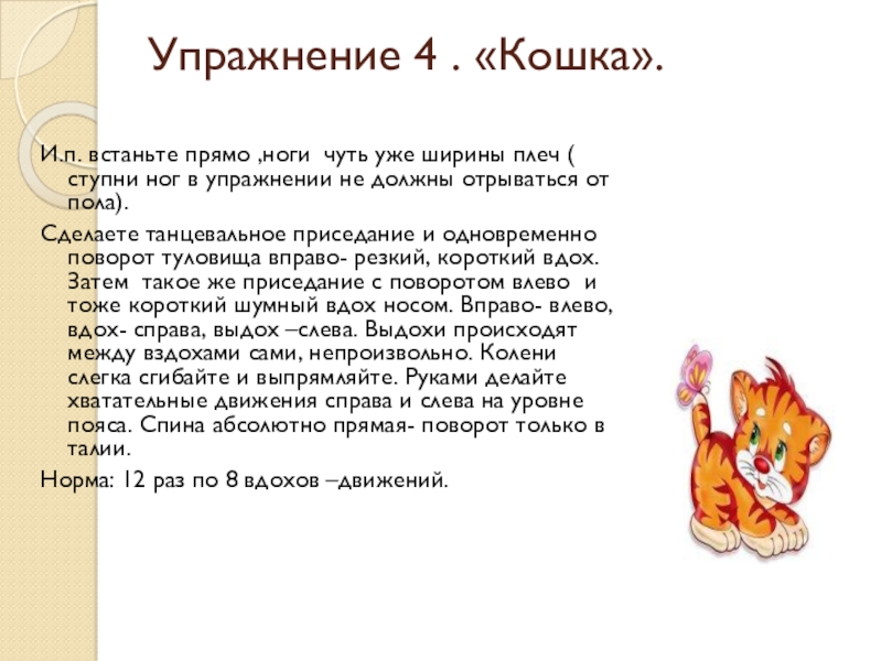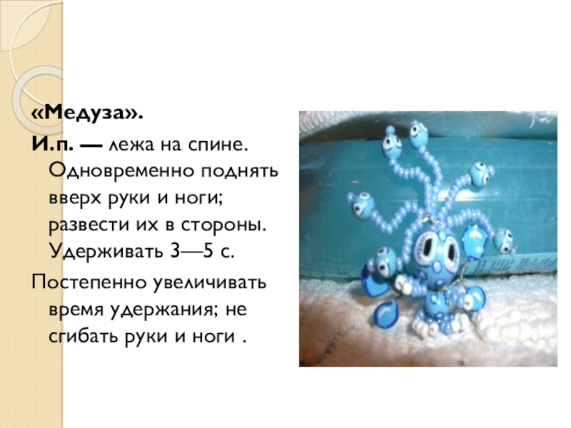 Постепенно увеличивать время удержания; не сгибать руки и ноги .