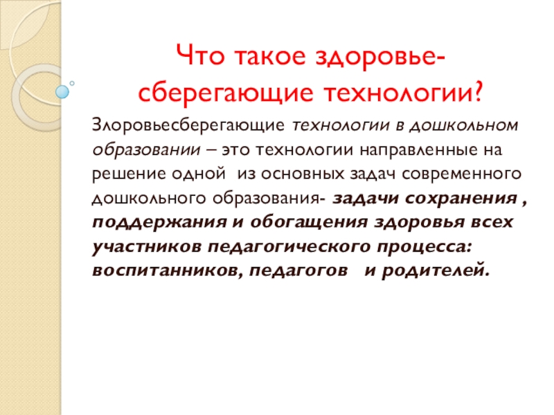 технологии направленные на решение одной из основных задач современного дошкольного образования- задачи сохранения , поддержания и обогащения здоровья всех участников педагогического процесса: воспитанников, педагогов и родителей.